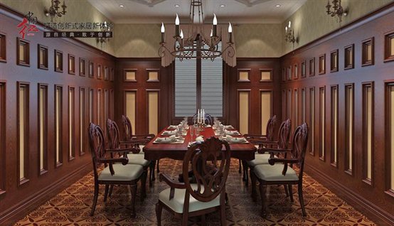 实木的餐桌,稳重而内敛,摆放整齐的餐具,仿古烛台式的吊顶灯,纯木的桌椅,像是在向客人展示着主人独特的个人品味。